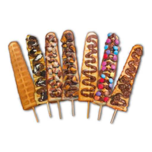 Crispy golden waffles served on a stick, dipped or drizzled with your favorite flavors for easy enjoyment.